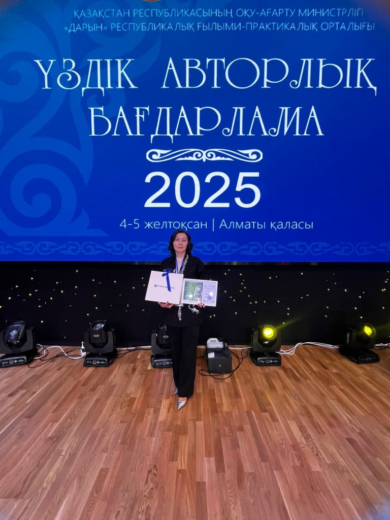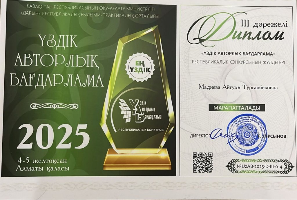 2025 жылғы 04-05 желтоқсан аралығында Алматы қаласы «Оқушылардың инновациялық шығармашылығы орталығы» КМҚК базасында өткен «Үздік авторлық бағдарлама» республикалық конкурсының қорытындысы бойынша «Арман» бөбекжайы МКҚК дене тәрбиесі нұсқаушысы Айгуль Турганбековна Мадиеваны жүлделі 3 – дәрежелі дипломмен марапатталуымен шын жүректен құттықтаймыз. Алдағы уақытта бағындырар белестеріңіз көп болсын! переведи на русский
